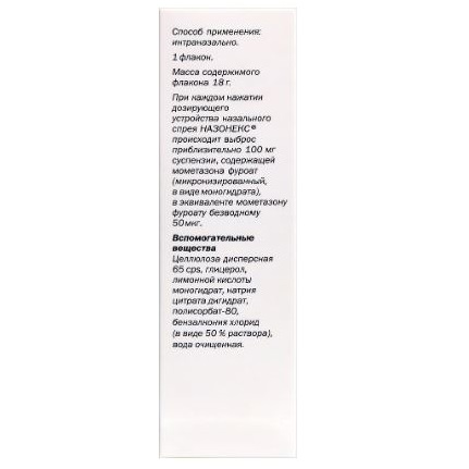 В случае развития местной грибковой инфекции носа или глотки может потребоваться прекращение терапии назальным спреем Назонекс® и проведение специального лечения. Сохраняющееся в течение длительного времени раздражение слизистой оболочки носа и глотки также может служить основанием для прекращения лечения назальным спреем Назонекс®.