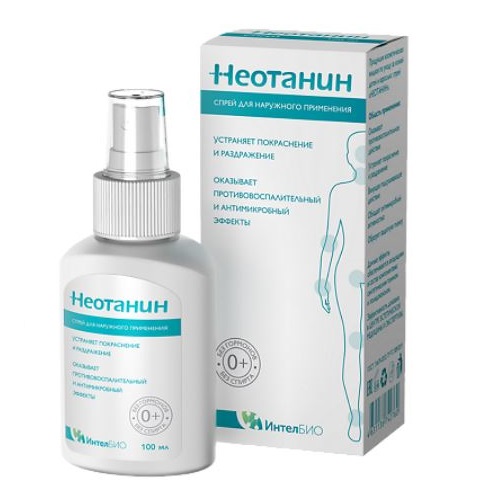 При остром воспалении с мокнутием применяется НЕОТАНИН спрей: •противовоспалительное, подсушивающее и вяжущее действие с антисептическим эффектом •двойное противозудное действие •быстрый противозудный эффект (в течение нескольких минут) •более выраженный клинический эффект и сокращение сроков лечения по сравнению c классическими формами местной терапии •не содержит гормонов •применение не приводит к системным побочным эффектам •применяется у детей с рождения •при локализации поражения на лице •при обширных (более 20% поверхности кожи) площадях поражения •у пациентов со стероидофобией (20—40% пациентов) •у пациентов с тяжелой сопутствующей соматической патологией •минимальный риск побочных реакций •не окрашивает кожу •отпускается без рецепта Механизм действия: Основным активным компонентом НЕОТАНИНА является синтетический танин. Танины относятся к веществам, оказывающим вяжущее, подсушивающее действие благодаря способности связывать и осаждать протеины (белки). Вторым активным компонентом НЕОТАНИНА является полидоканол, который обладает противозудным действием. Противозудный эффект полидоканола развивается быстро, длительность действия составляет в среднем 3–4 часа. Также полидоканол усиливает вяжущее, подсушивающее действие танина и способствует заживлению эрозий. Механизм действия НЕОТАНИНА Связывает белки тканевой жидкости в тонкую пленку. Предотвращается проникновение бактерий. Кожа подсушивается и регенерирует быстрее. Угнетает активность прововоспалительных ферментов. Блокирует передачу импульсов чувствительным нервным окончаниям. Лечебный эффект Создает условия для быстрого заживления поврежденных участков кожи. Aнтисептический эффект. Помогает защитить поврежденные участки кожи от микробного воздействия и зуда. Противовоспалительный эффект. Устраняет покраснение и раздражение. Устраняет зуд, боль и раздражение. Область применения Состояния кожи, сопровождающиеся нарушением целостности кожного покрова, мокнутием, раздражением и зудом. В том числе: •при обострении атопического, аллергического, контактного дерматита, экземе, псориазе и т.п. •при пеленочном (памперсном) дерматите •при ветряной оспе, герпесе, опоясывающем лишае и т.п. •при грибковых поражениях кожи с эрозиями и трещинами •при поверхностных пиодермиях •при всех дерматозах, сопровождающихся зудом (т.к. в составе полидоканол, который оказывает противозудное действие через несколько секунд после нанесения на кожу). спрей косметический, однородная однофазная жидкость, без посторонних примесей, бесцветный, запах легкий специфический