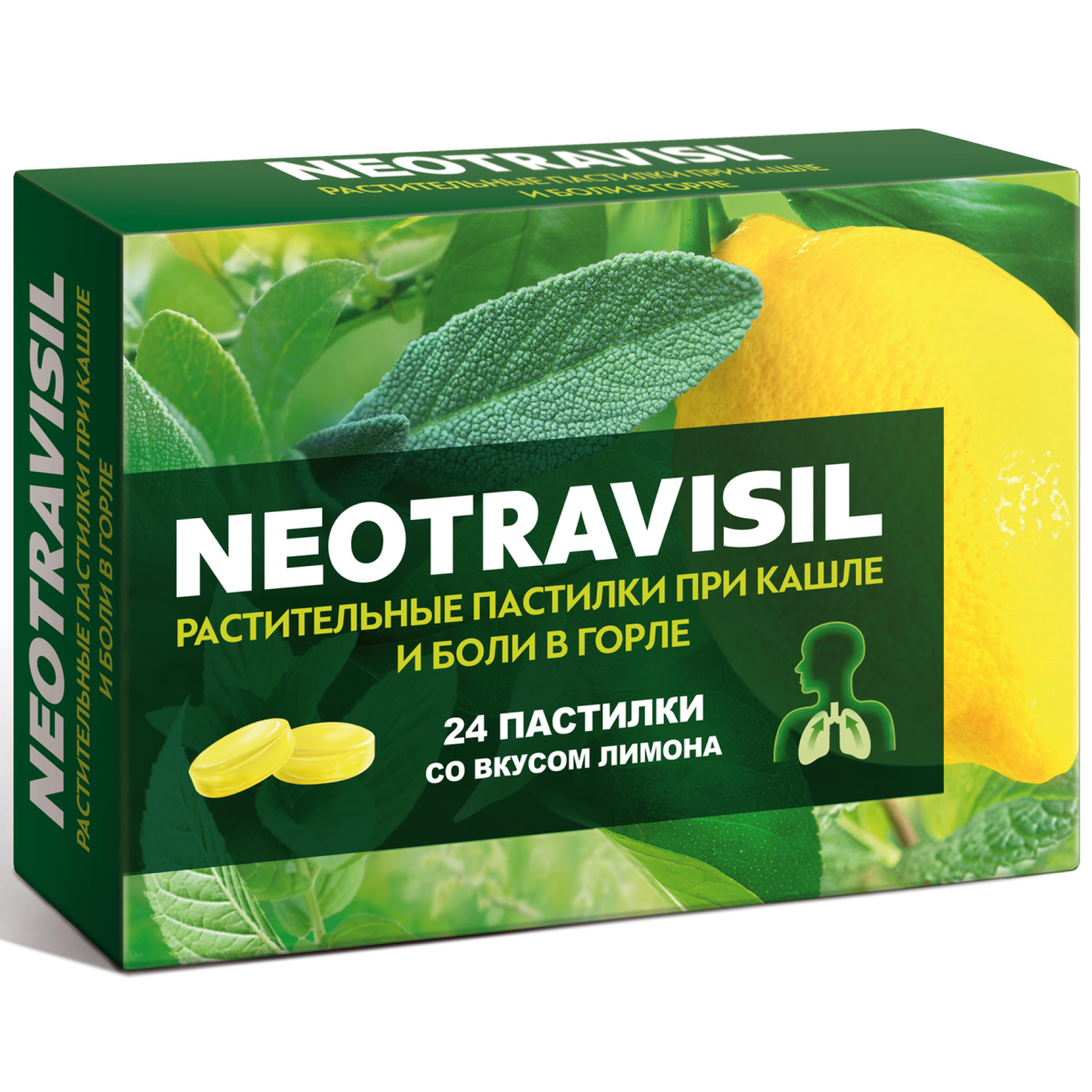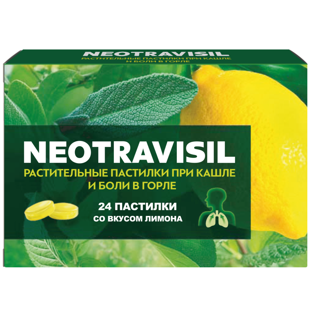 NEOTRAVISIL способствует снижению риска развития острых и хронических воспалительных заболеваний дыхательных путей, сопровождающихся кашлем (фарингит, ларингит, в том числе «лекторский», трахеит, бронхит) и болью в горле. NEOTRAVISIL показан к приему в качестве биологически активной добавки к пище - источника ментола, содержащей эфирные масла.