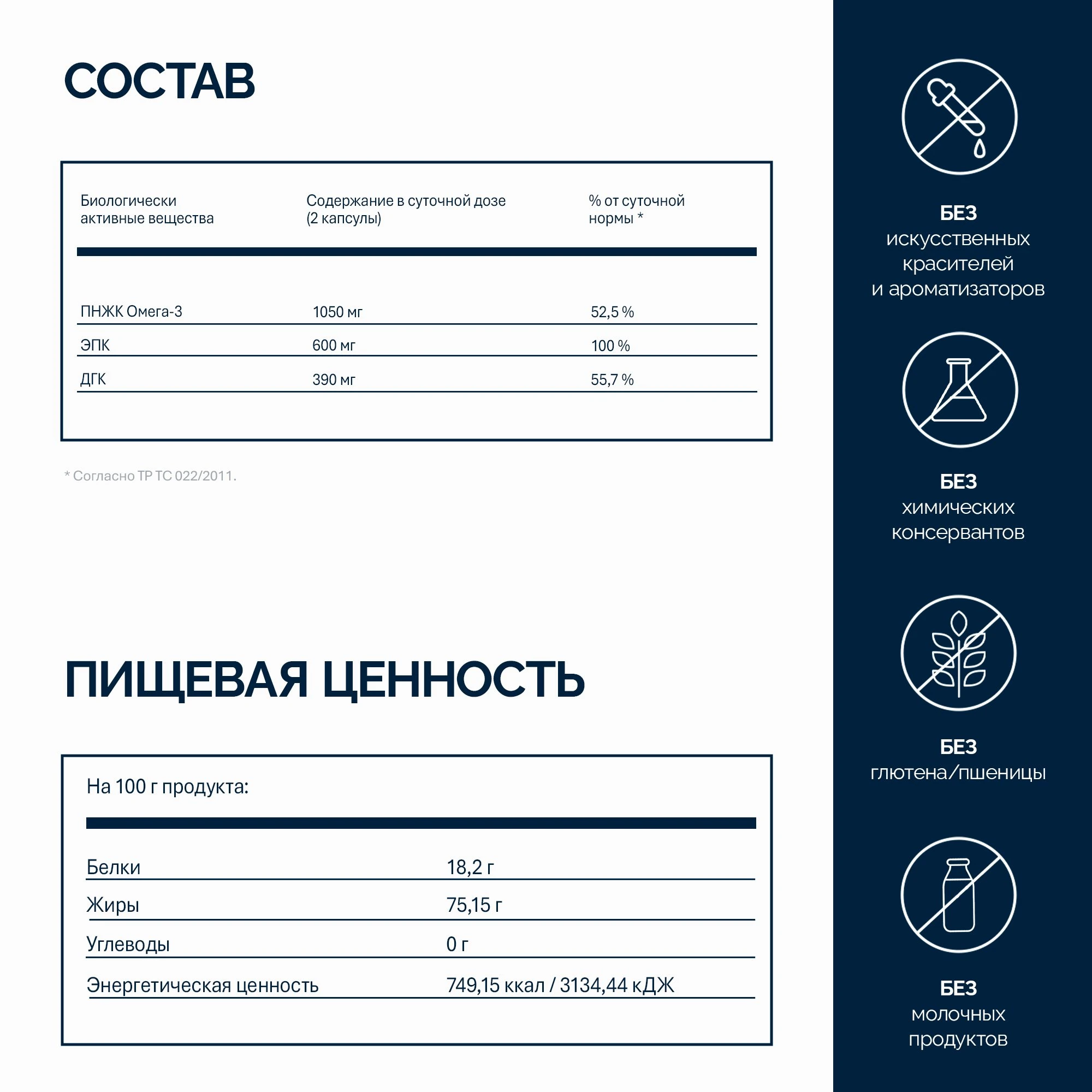 Форма Омега-3 ПНЖК – этерифицированные триглицериды имеют повышенную биодоступность Омега-3 ПНЖК (по сравнению с этиловыми эфирами), что способствует более легкому усвоению и быстрому восстановлению уровня Омега-3 в организме. Максимальная концентрация Омега-3 в 1 капсуле отлично подойдет для восполнения дефицита Омега-3 в организме, в том числе для вегетарианцев, так как капсула произведена из рыбьего желатина.