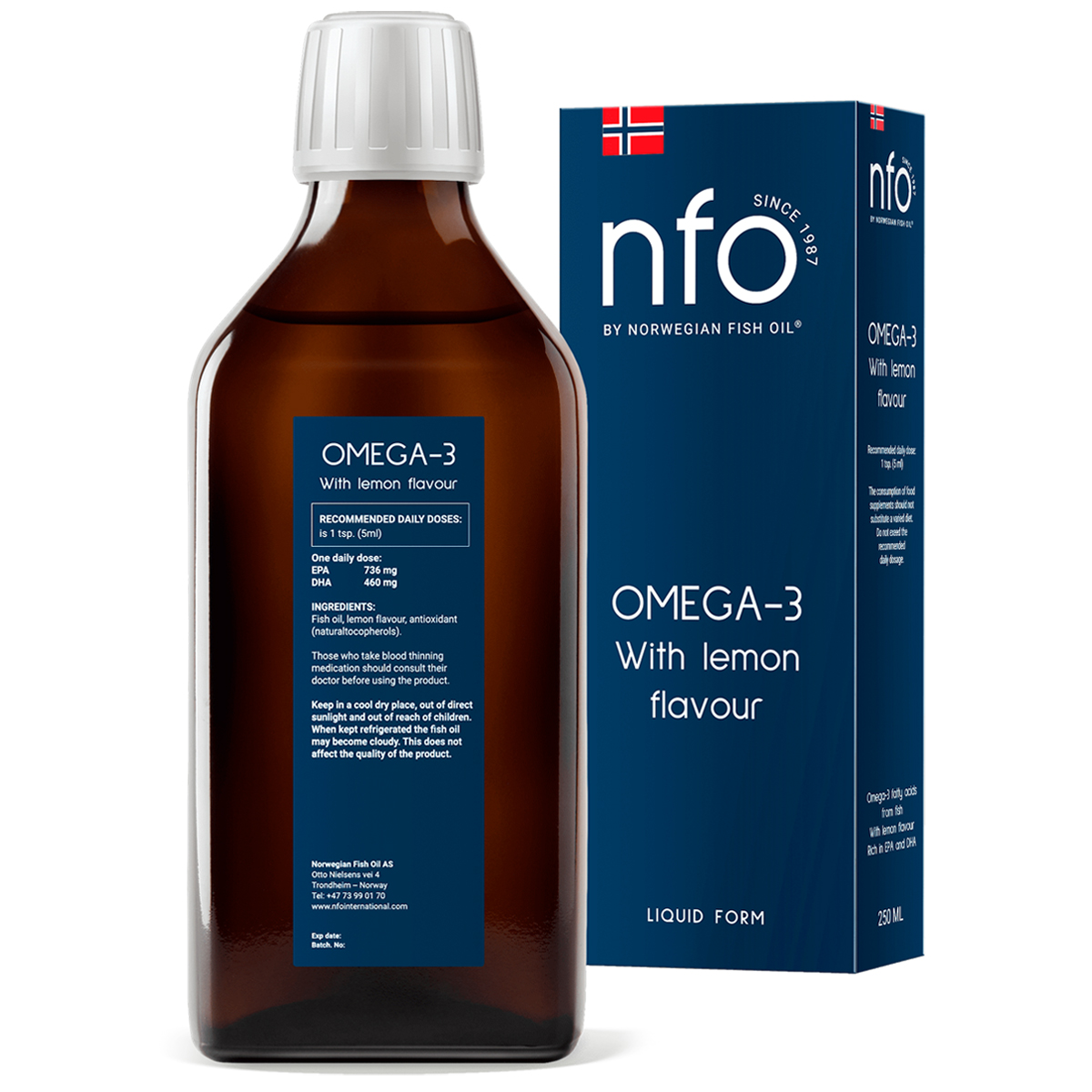 NFO® Omega-3 with lemon flavor (НФО Омега-3 со вкусом лимона) - натуральный высокоочищенный рыбий жир в жидкой форме со вкусом лимона.