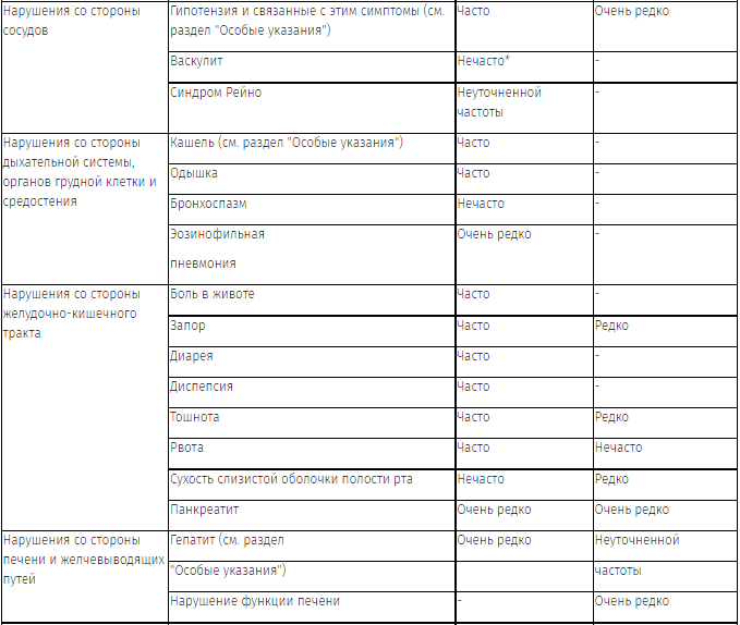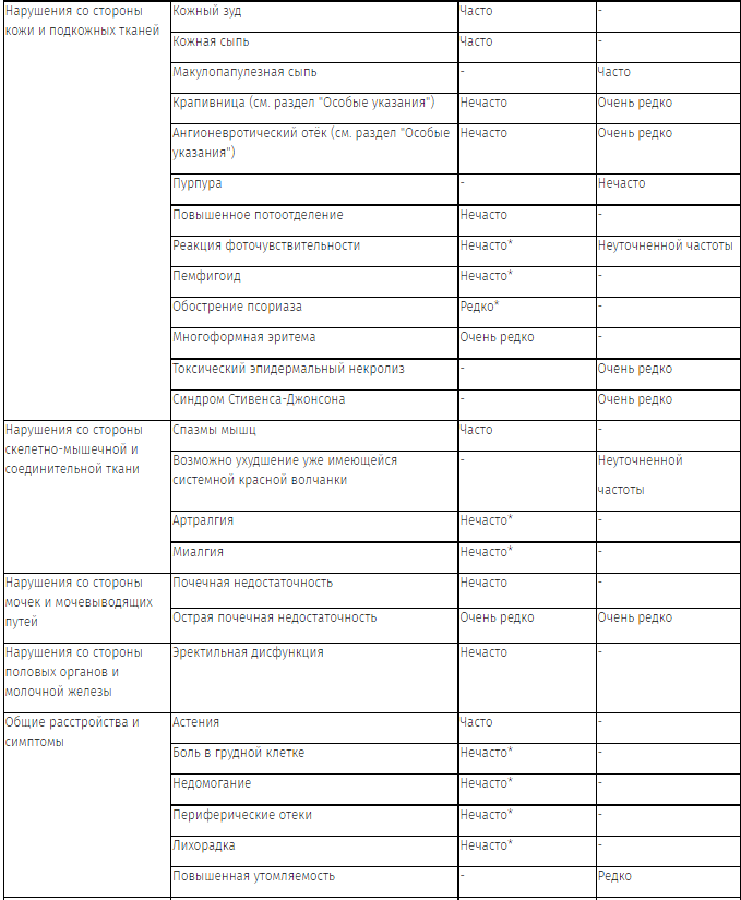 Частота побочных реакций, наблюдавшихся во время клинических исследований и/или при постмаркетинговом наблюдении, приведена в виде следующей градации: очень часто (≥1/10); часто (≥1/100, <1/10); нечасто (≥1/1000, <1/100); редко (≥1/10000, <1/1000); очень редко (<1/10000); неуточненной частоты (частота не может быть подсчитана по доступным данным).