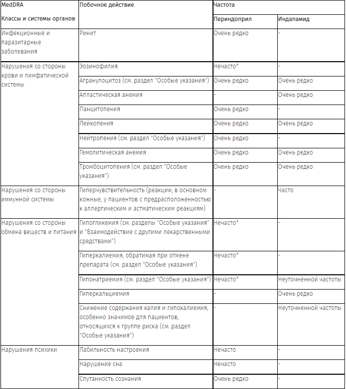 - для периндоприла: головокружение, головная боль, парестезия, дисгевзия, нарушение зрения, вертиго, звон в ушах, гипотензия, кашель, одышка, боль в животе, запор, диспепсия, диарея, тошнота, рвота, кожный зуд, кожная сыпь, спазмы мышц и астения;