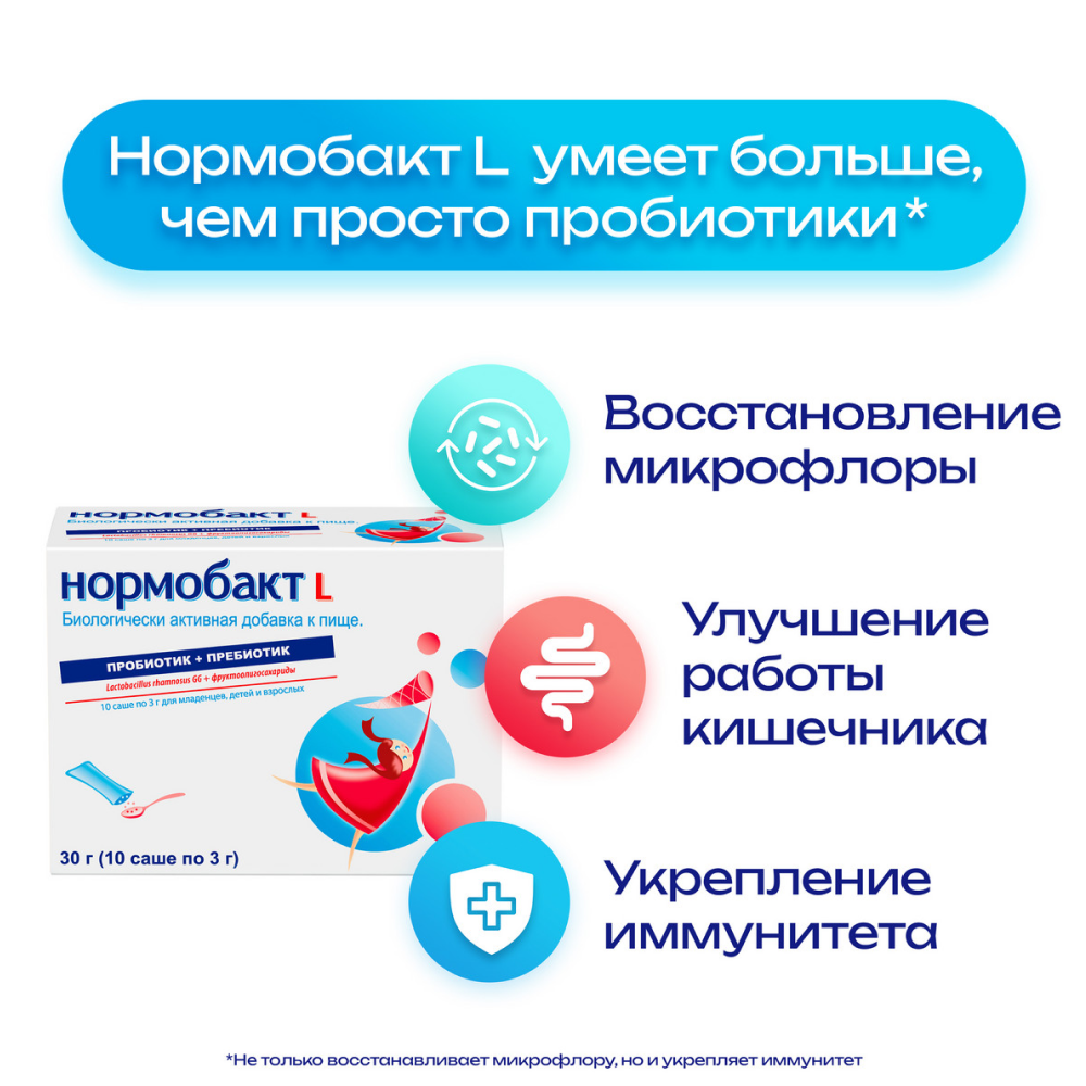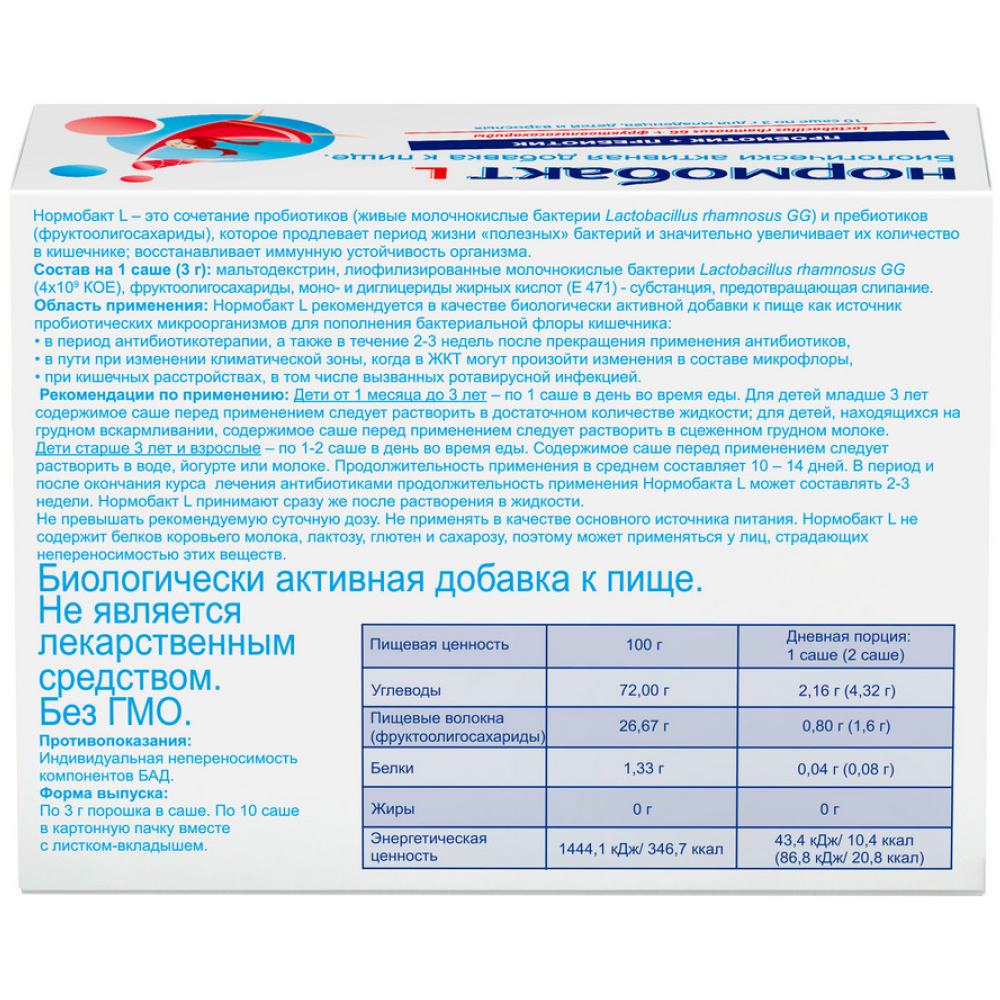 Нормобакт L – биологически активная добавка к пище, сочетающая пробиотики (живые молочнокислые бактерии Lactobacillus rhamnosus GG) и пребиотики (фруктоолигосахариды). Такая комбинация продлевает период жизни "полезных" бактерий и значительно увеличивает их количество в кишечнике; восстанавливает иммунную устойчивость организма.
