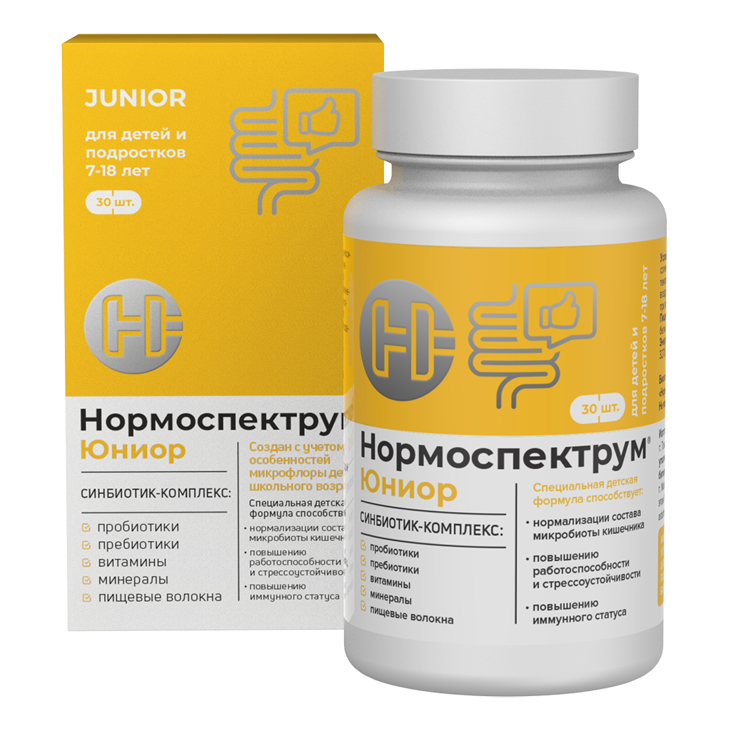 В мультикомпонентном синбиотик – комплексе «Нормоспектрум® Юниор» консорциум пробиотиков специально подобран с учетом особенностей состава микрофлоры детей и подростков в возрасте от 7 до 18 лет и содержит виды и штаммы живых бактерий (B.bifidum, В.breve, B.longum, и т.д.), которые наиболее физиологичны для детей данной возрастной группы.