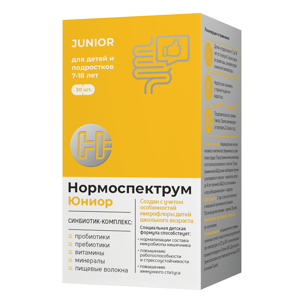 В разработке «Нормоспектрум® Юниор» использованы всесторонне изученные, активные, устойчивые к действию ферментов желудочно - кишечного тракта живые штаммы полезных бактерий. Они способствуют улучшению обменных процессов, повышению сопротивляемости организма к воздействию различных вредных факторов, участвуют в белковом и жировом обмене, а также синтезе важных аминокислот и витаминов.