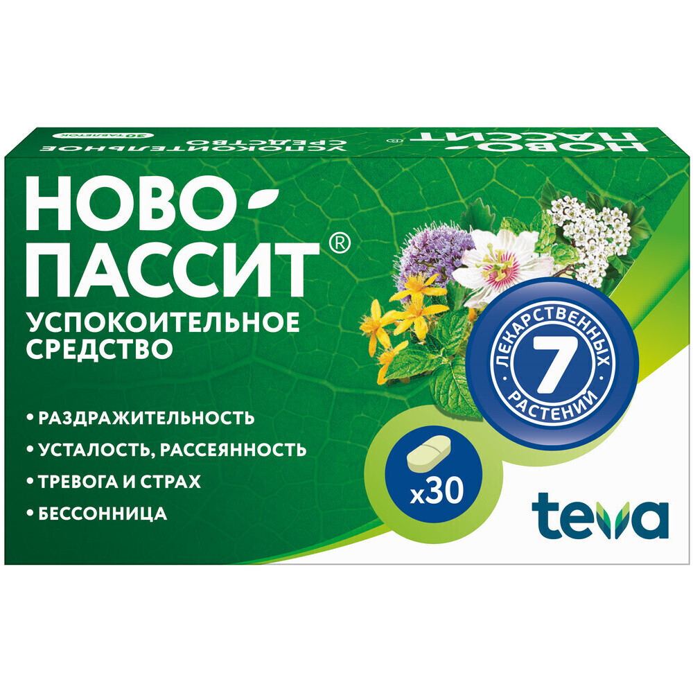 Ново-Пассита экстракт сухой (1:6,5) (получаемый из валерианы лекарственной корневищ с корнями (5 ч), мелиссы лекарственной травы (2 ч), зверобоя продырявленного травы (5 ч), боярышника листьев и цветков (5 ч), пассифлоры инкарнатной травы (1 ч), хмеля обыкновенного соплодий (5 ч), бузины черной цветков (2 ч)) 157,5 мг; гвайфенезин 200,0 мг