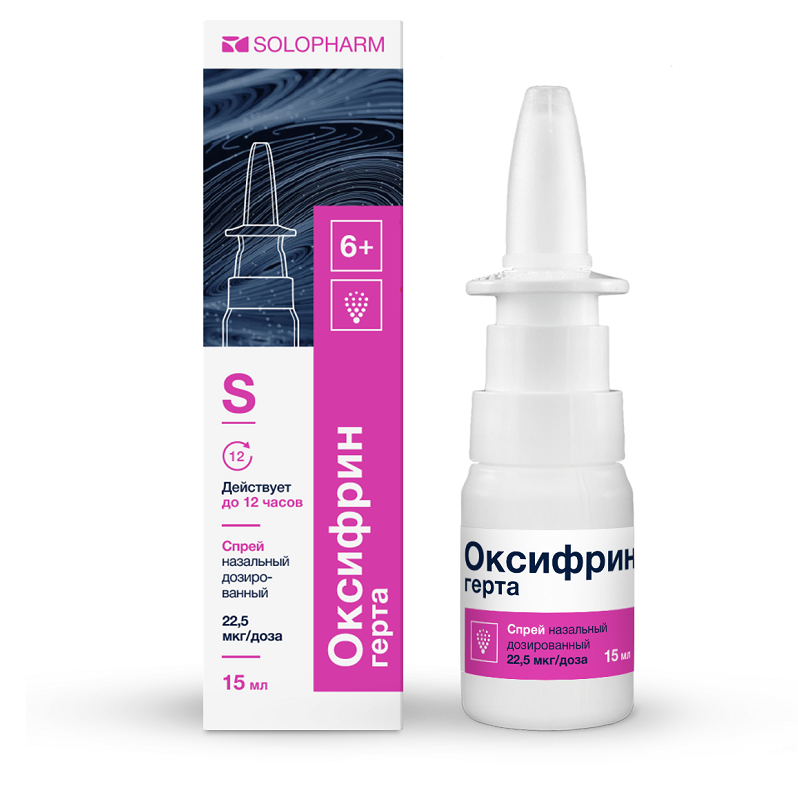 Препарат Оксифрин, спрей назальный дозированный 11,25 мкг/доза начинает действовать быстро, в течение нескольких минут. Препарат Оксифрин, спрей назальный дозированный 22,5 мкг/доза действует с 25 секунды. Продолжительность действия препаратов до 12 часов.