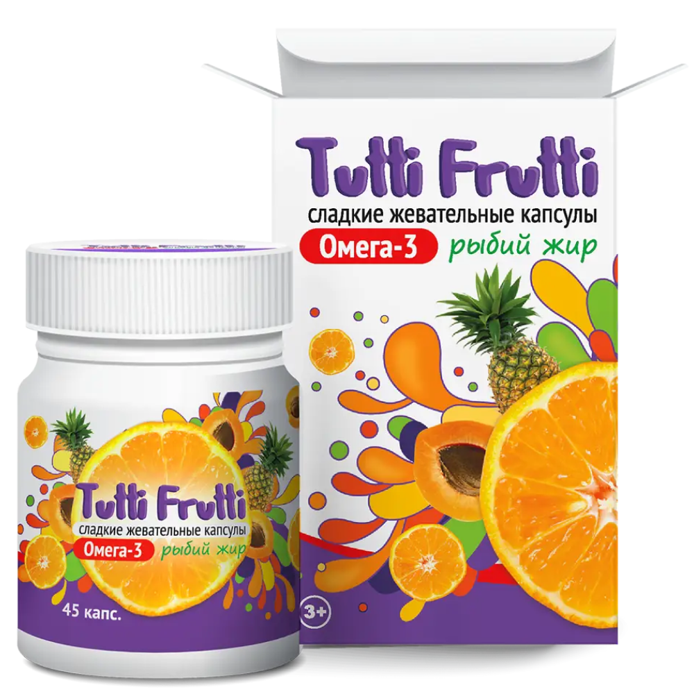 «Тутти-фрутти Омега-3 сладкие жевательные капсулы» - это натуральный рыбный жир тунца, заключенный во вкусную, жевательную капсулу. Рыбный жир тунца является богатым источником докозагексаеновой кислоты (ДГК/DHA) Омега-3.