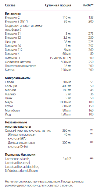 Продукт полностью состоит из натуральных компонентов, которые подобраны в необходимой концентрации. Средство нормализует их содержание в крови, не вызывая передозировку. Отличительная особенность Orthomol Natal — наличие пробиотиков, которые нормализуют пищеварение.