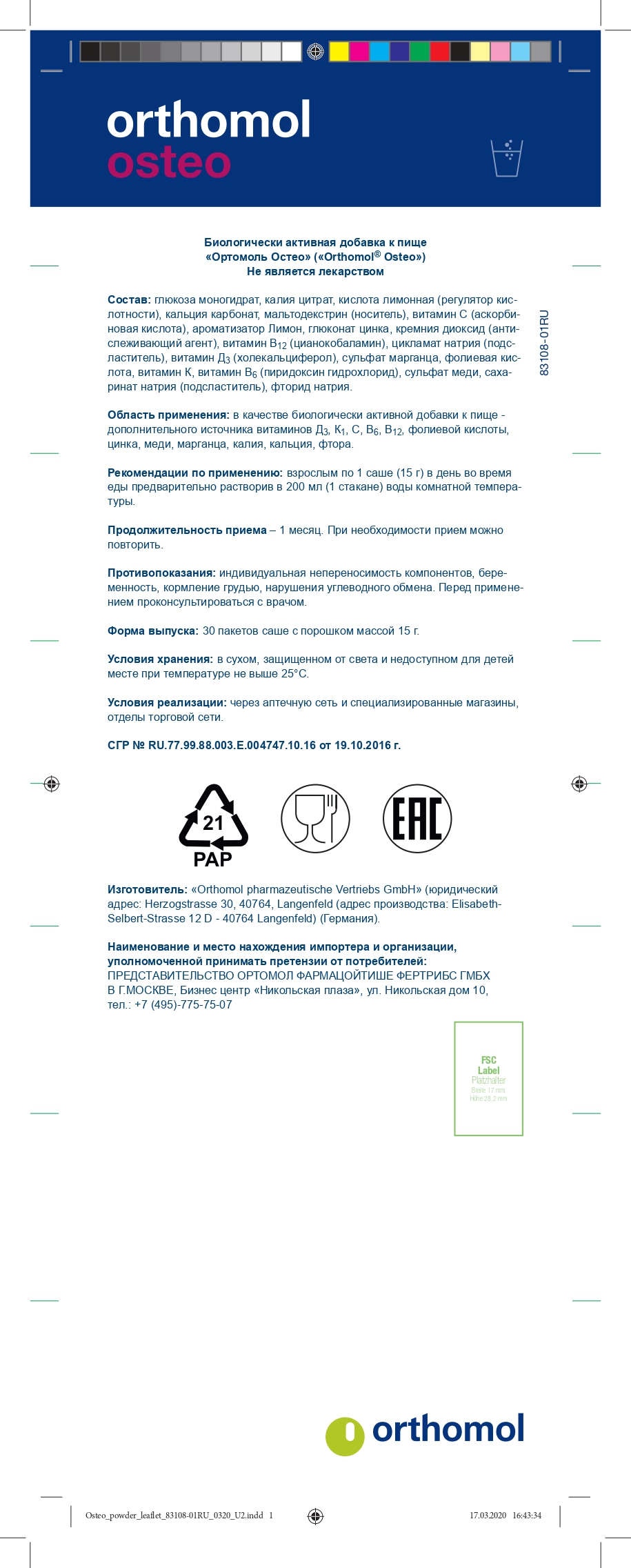 Orthomol Osteo — ортомолекулярная добавка, предназначенная для восстановления минеральной плотности костей. Может использоваться людьми с усиленным выведением микроэлементов из организма или их недостаточным поступлением. Подобное происходит на фоне приема сильных мочегонных препаратов, при обменных и гормональных нарушениях, недостаточности питания. Профилактический курс Ортомол Остео показан пациентам, с недостатком кальция; больным, в недавнем прошлом перенесшим переломы костей.