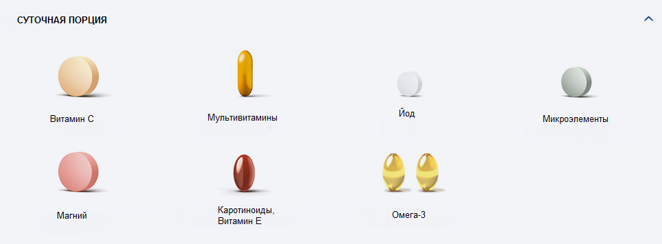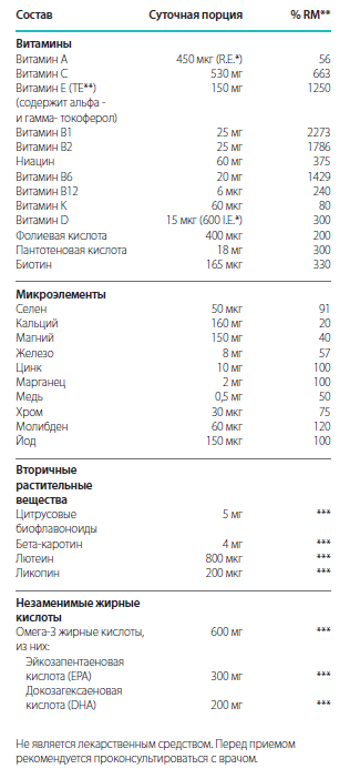 Состав (капсулы 1000 мг): соевое масло, желатин (из говяжьих шкур), глицерин, пальмовое масло, ниацинамид, глицерин моностеарат, кальция D-пантотенат, цитрусовые биофлавоноиды, пиридоксина гидрохлорид, лецитин (из подсолнечника), тиамина моногидрат, рибофлавин, титана диоксид, рибофлавин, ретинола пальмитат, холекальциферол, цианокобаламин, вода очищенная, фолиевая кислота, биотин, фитоменадион.