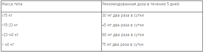 Рекомендованный режим дозирования осельтамивира капсулы 30 и 45 мг или экстемпорально приготовленной суспензии