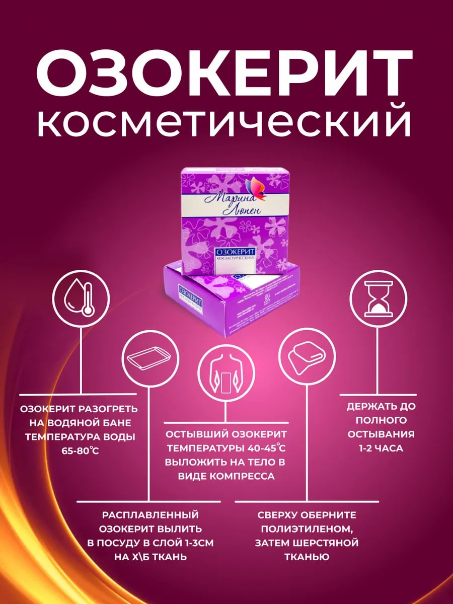 Озокерит необходимо разогреть на водяной бане до температуры плавления (65-80°С); Расплавленный озокерит выливают в посуду слоем 1-3 см, предварительно выстелив дно посуды х/б тканью; Через несколько минут остывший до 40-45°С озокерит накладывают на проблемный участок тела в виде компресса; В заключении компресс оборачивают клеенкой или полиэтиленовым пакетом, затем – шерстяной тканью; Длительность процедуры – 1-2 часа до полного остывания озокерита, после чего озокерит удаляют. Можно использовать многократно.