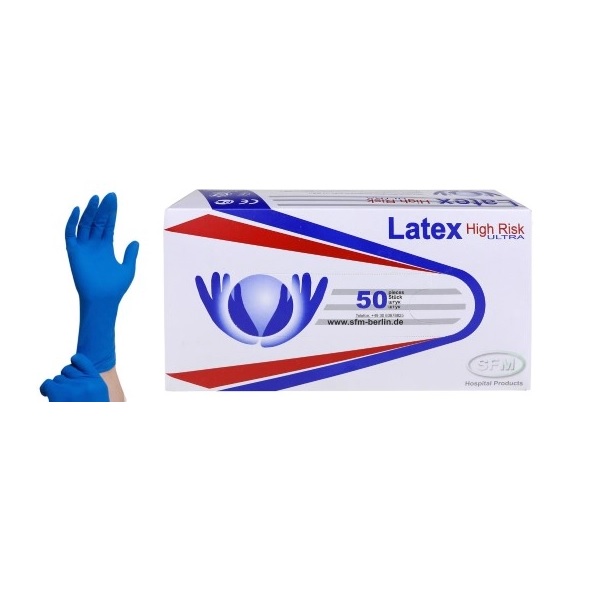 Перчатки медицинские диагностические (смотровые) одноразовые нестерильные «SFM» из натурального латекса текстурированные неопудренные с двойной хлоринацией повышенной прочности синего цвета предназначены для одноразового использования в качестве защитного барьера при ношении на руках медицинского работника во время осмотра/лечения пациента или для других санитарных целей, используются в основном как двусторонний барьер для защиты пациента и медперсонала от различных загрязнений.