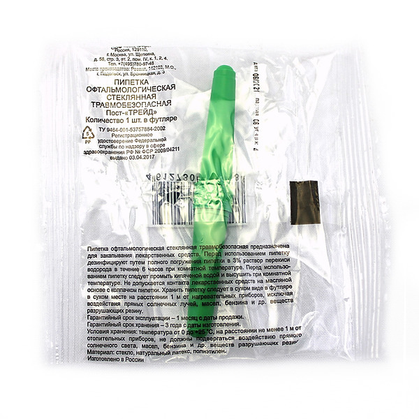Пипетка глазная травмобезопасная стеклянная изготавливается из стекла марки ХС-3, НС-3, пипетка состоит из стеклянной части и комплектуется резиновым колпачком,может быть в пластмасовом футляре. пипетку рекомендовано хранить в футляре.