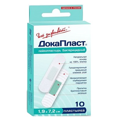 Пропитка раствором бриллиантового зеленого обеспечивает бактерицидное действие пластыря.