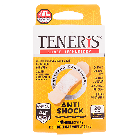 Лейкопластыри TENERIS ANTISHOCK с ионами серебра, на полимерной основе, предназначены специально для смягчения давления на поврежденный участок кожи и предупреждения появления мозолей: