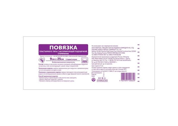 Повязка пластырного типа с абсорбирующей подушечкой, стерильная, на нетканой основе с вискозной подушечкой.