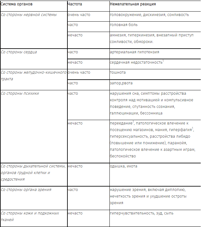 Прамипексол может оказывать значительное влияние на способность управлять транспортными средствами или работать с механизмами. Могут возникать галлюцинации или сонливость.
