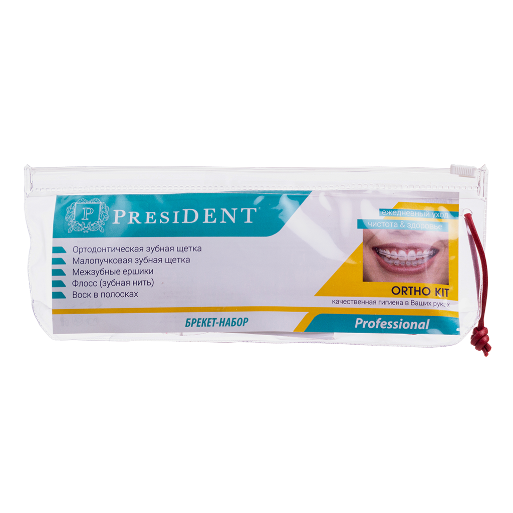 Брекет-набор President (Президент) обеспечивает гигиену полости рта с брекет-системами. Он позволяет качественно очищать зубы и ортодонтические конструкции от частичек пищи и налета в период проведения стоматологического лечения.