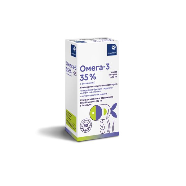 В 1 капсуле содержится: ПНЖК Омега-3 350 мг, в т. ч. эйкозапентаеновой (EPA 180 мг) и докозагексаеновой кислот (DHA 120 мг); Витамин Е - 3,3 мг.