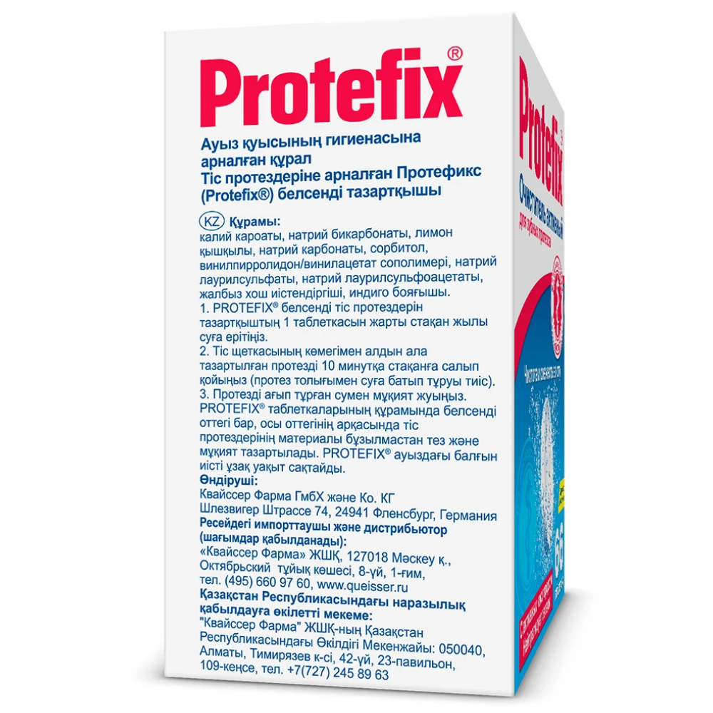 Очищающие таблетки Protefix® (Протефикс) содержат активный кислород. Они, не повреждая протез механически, идеально очищают его даже в самых труднодоступных местах, уничтожают практически все болезнетворные микроорганизмы и неприятные запахи, удаляют налет и зубной камень, восстанавливают естественный цвет протезов и позволяют избежать инфекций в полости рта.