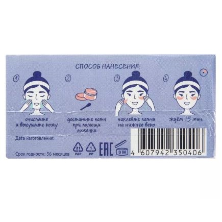 Достать патчи из банки специальной лопаточкой. Наклеить на нижнее веко - если наклеить узкой стороной к носу, помогут от отёчности и морщин, а если широкой — от тёмных кругов. Через 10-15 минут снять.