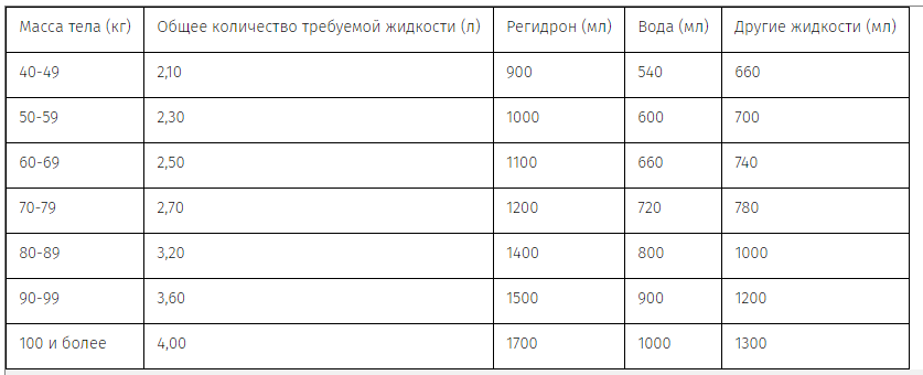 Для восполнения жидкости Регидрон® принимают в течение первых 6-10 часов в количестве, которое вдвое превышает потерю массы тела, вызванную диареей. Например, если потеря массы тела составляет 400 г, объем раствора Регидрон®, составляет 800 мл. В течение этой фазы применение других жидкостей не требуется. Принимать пищу в первые 4 часа восполнения жидкости не рекомендуется. При приеме больших объемов возможно возникновение рвоты.
