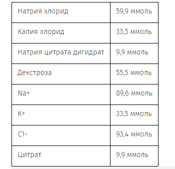 Препарат представляет собой глюкозо-электролитную смесь, в состав которой входят (на 1 пакетик): натрия хлорид - 3,5 г, калия хлорид - 2,5 г, натрия цитрата дигидрат - 2,9 г, декстроза- 10,0 г. В растворе, полученном при растворении 1 пакетика в 1 л воды, содержатся следующие концентрации действующих веществ: