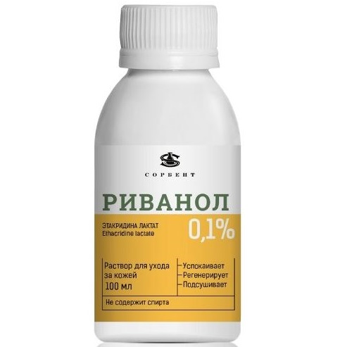 Раствор «РИВАНОЛ» 0,1% - универсальное средство для ухода за поврежденной кожей. Предназначен для ухода за кожей с различными поверхностными повреждениями и высыпаниями. Благодаря входящему в состав этакридин лактату (Риванолу) подсушивает воспаленные участки, снимает покраснение, удаляет загрязнения с поверхности кожи и обладает антимикробным свойством. Способствует обновлению поврежденной кожи и эпидермальных слоев клеток, оказывая успокаивающее действие. Предотвращает появление раздражения. Обладает приятным ароматом. Легкая жидкая текстура (производится на основе воды).