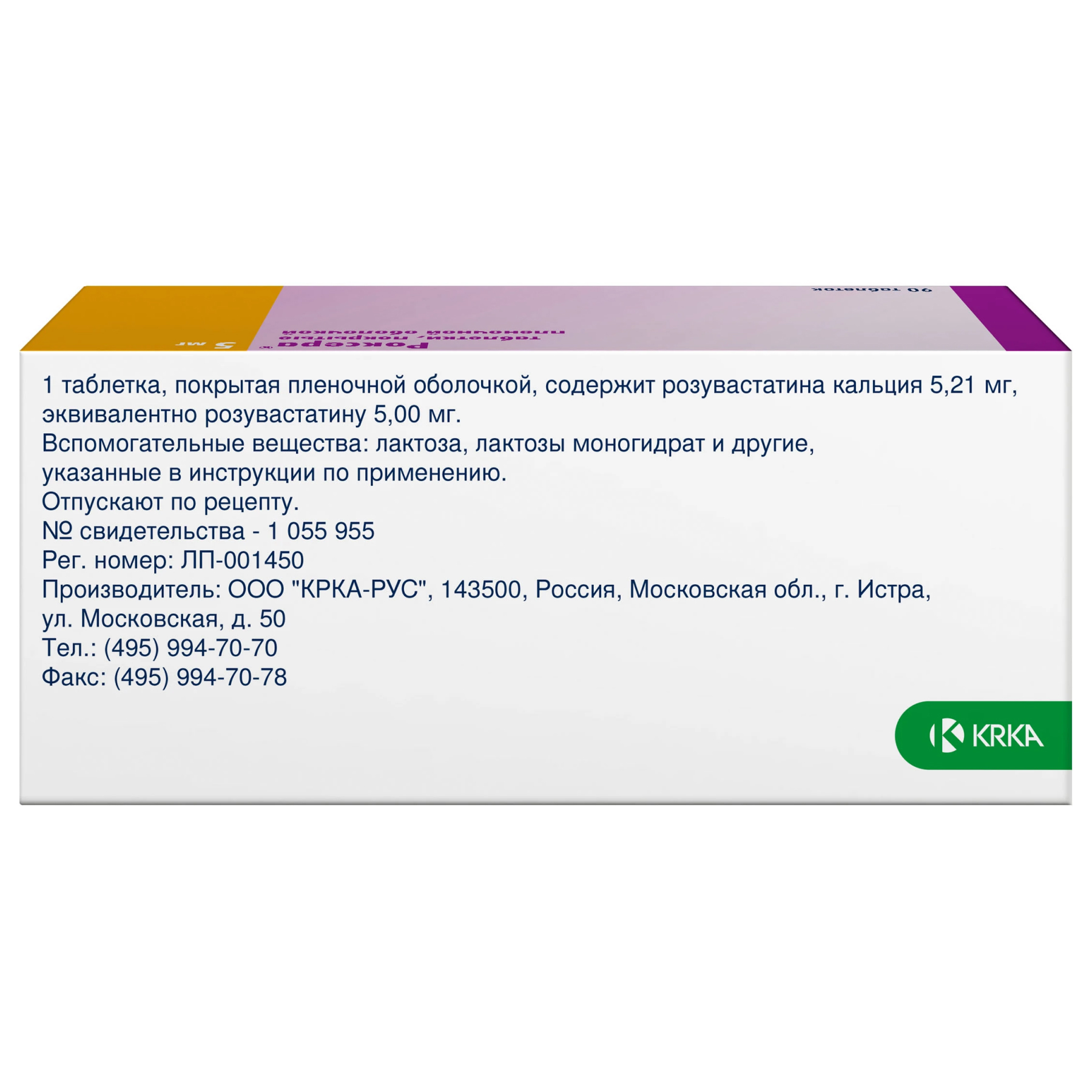 Активное вещество: розувастатин кальция 5.21 мг, что соответствует содержанию розувастатина 5 мг.