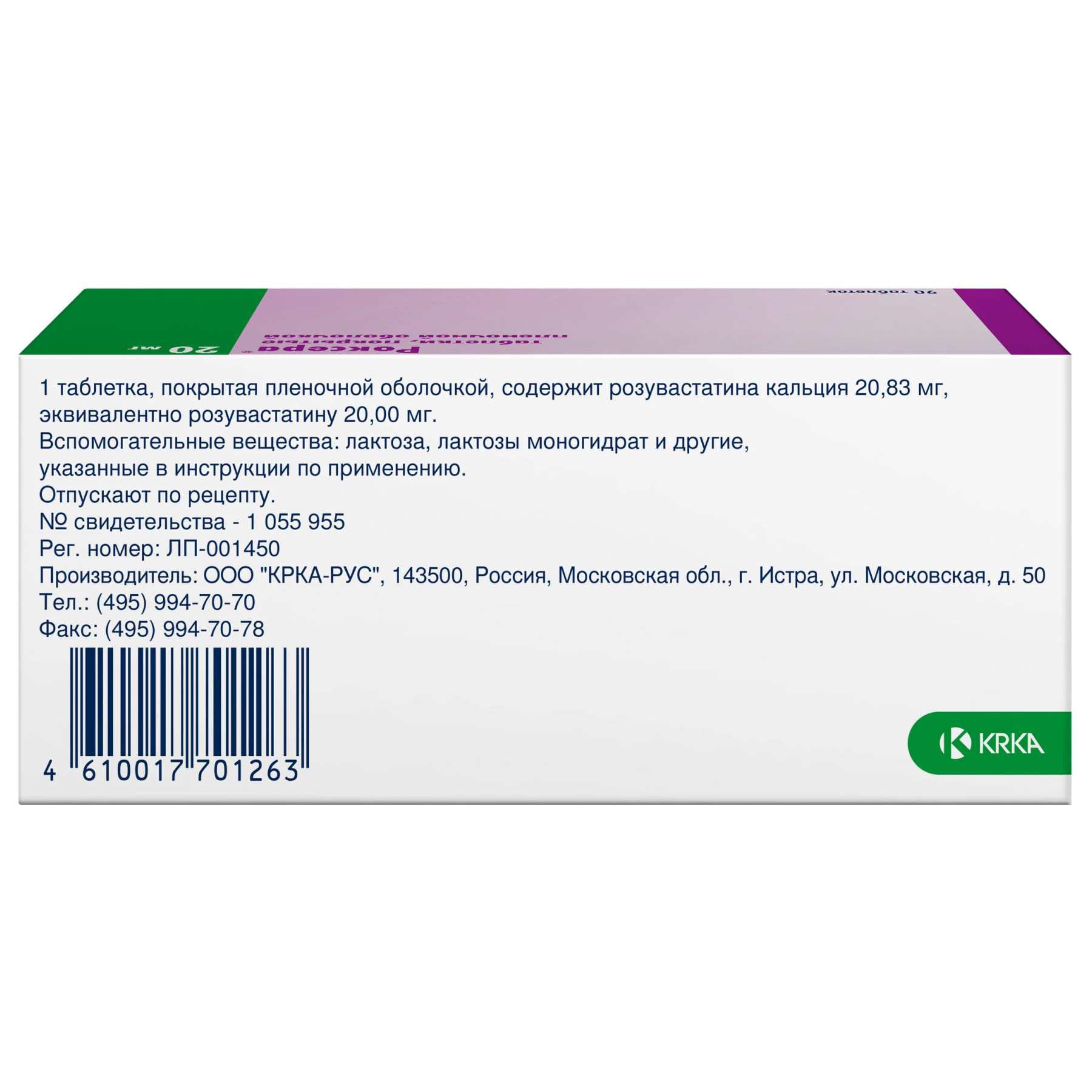 Действующее вещество: Розувастатин кальция 20,83, эквивалентно розувастатину 20,00 мг.