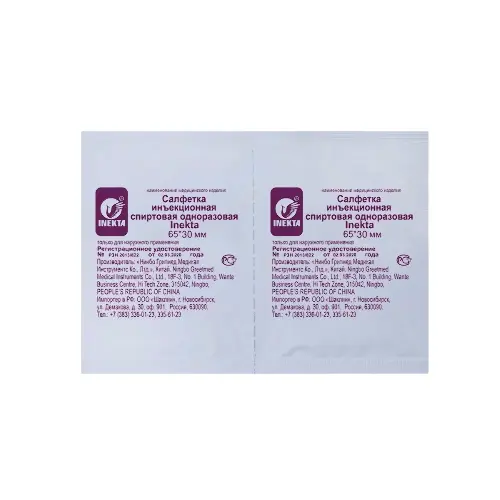 Салфетка инъекционная спиртовая одноразовая inekta предназначена для антисептической обработки ран, для обработки кожи медицинского персонала перед манипуляциями, для обработки кожи пациента до и после постановки инъекций, заборов крови или хирургических вмешательств, а также для антисептической обработки поверхностей и медицинского инструментария. Размер салфеток составляет 65 х 30 мм, а в упаковке 100 штук, что делает их удобными для использования в медицинских учреждениях и дома. Салфетка изготовлена из нетканого материала, не оставляет на поверхности кожи волокнистых компонентов, не вызывает аллергических или местно-раздражающих эффектов. Основа равномерно пропитана спиртом, содержание этилового спирта в пропитывающем растворе 75%, количество пропитывающего состава в салфетке не менее 0,85 гр.