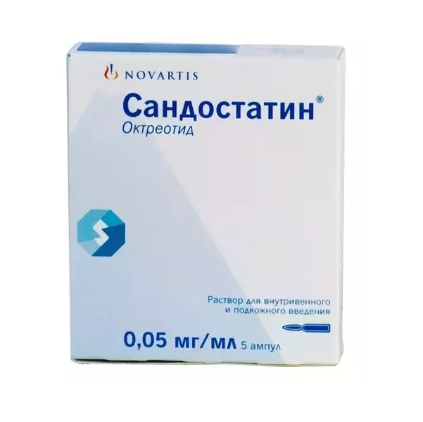 Действующее вещество препарата Сандостатин®, октреотид, является синтетическим октапептидом, производным естественного гормона соматостатина обладающим сходными с ним фармакологическими эффектами, но значительно большей продолжительностью действия. Октреотид подавляет секрецию гормона роста (ГР), как патологически повышенную, так и вызываемую аргинином, физической нагрузкой и инсулиновой гипогликемией. Октреотид подавляет также секрецию инсулина, глюкагона, гастрина, серотонина, как патологически повышенную, так и вызываемую приемом пищи, также подавляет секрецию инсулина и глюкагона, стимулируемую аргинином. Октреотид подавляет секрецию тиреотропина, вызываемую тиреолиберином.