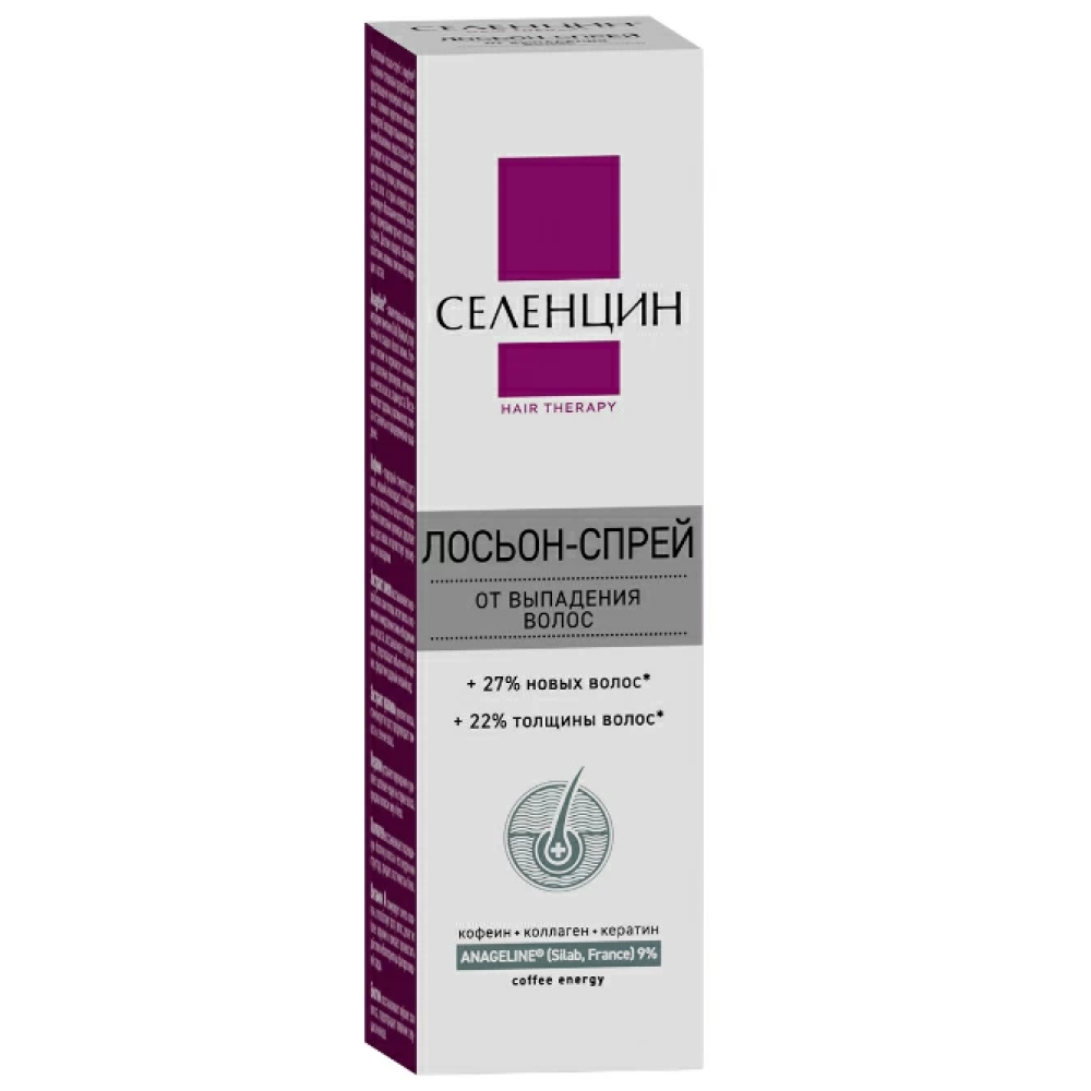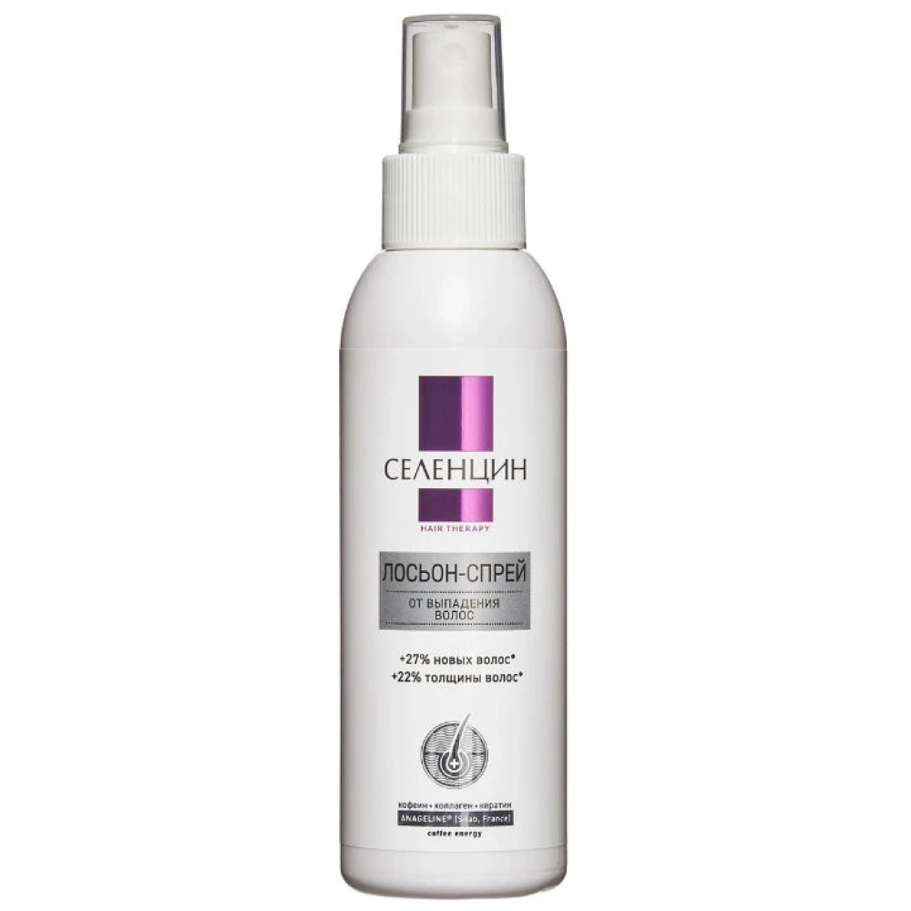 Укрепляющий лосьон-спрей Селенцин "Hair Therapy" — уникальный лосьон на основе французского запатентованного комплекса Anageline®, рекомендуемый для предотвращения хронического, длительного выпадения и поредения волос, для укрепления и восстановления жизненного цикла волосяных фолликулов.