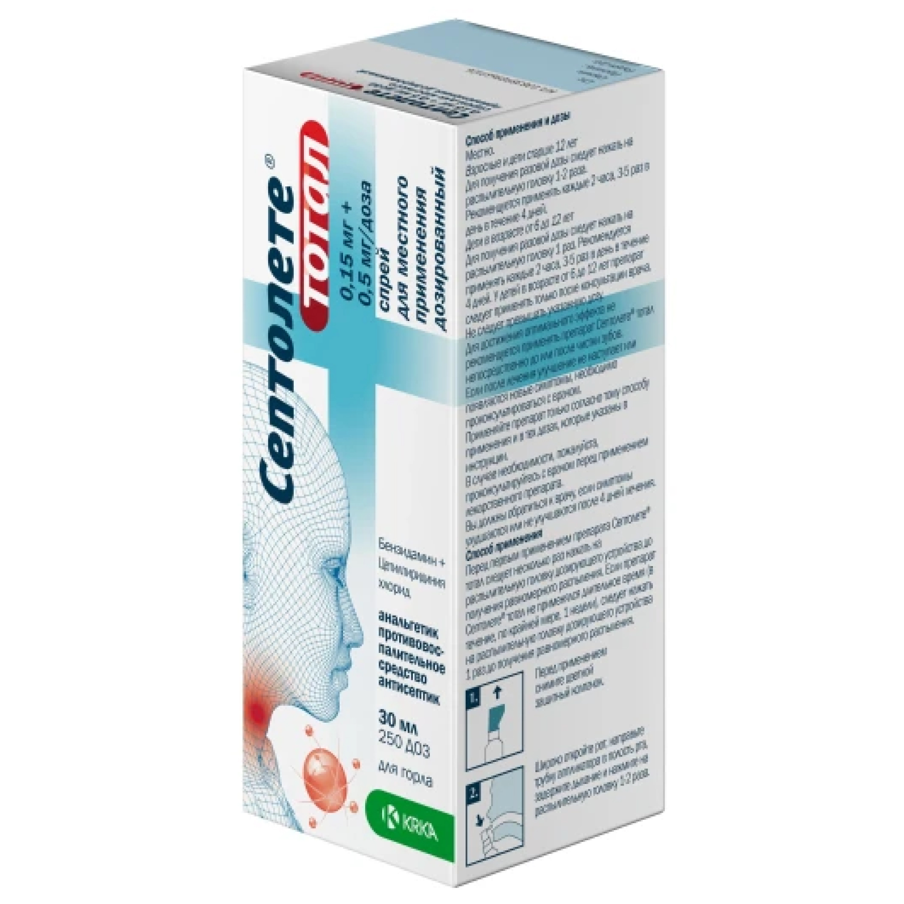 Перед первым применением препарата Септолете® тотал следует несколько раз нажать на распылительную головку дозирующего устройства до получения равномерного распыления. Если препарат Септолете® тотал не применялся длительное время (в течение, по крайней мере, 1 недели), следует нажать на распылительную головку дозирующего устройства 1 раз до получения равномерного распыления.