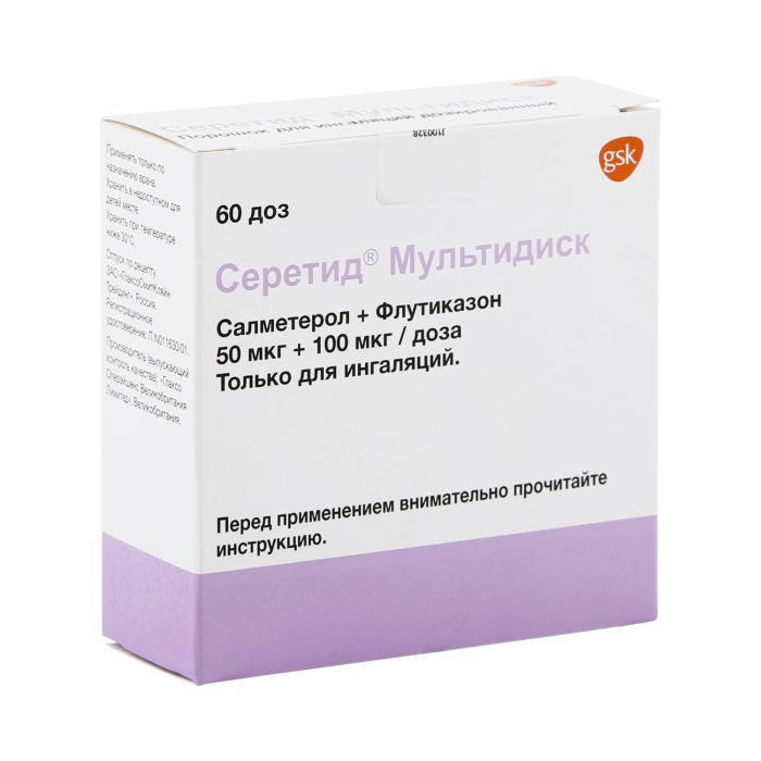 Салметерол предотвращает возникновение симптомов бронхоспазма, флутиказона пропионат улучшает легочную функцию и предотвращает обострение заболевания. Препарат Серетид® Мультидиск из-за более удобного режима дозирования может быть альтернативой для пациентов, которые одновременно получают агонист β2-адренорецепторов и ингаляционный ГКС из разных ингаляторов.