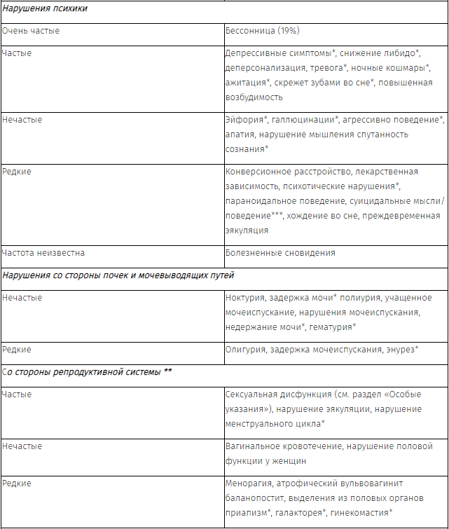 Риск проявления этих симптомов зависит от нескольких факторов, включая длительность терапии и дозировку, а также скорость снижения дозы. Наиболее частыми реакциями бывают головокружение, нарушения чувствительности (включая, парестезию), нарушения сна (включая бессонницу и глубокий сон), ажитация или тревога, тошнота и/или рвота, тремор и головная боль. Обычно эти симптомы легкой и средней степени тяжести; тем не менее, в некоторых случаях они могут быть тяжелыми. Обычно эти симптомы возникают в течение первых нескольких дней отмены терапии, но имеются очень редкие сообщения о развитии таких симптомов у пациентов, которые по неосторожности пропустили дозу. Обычно эти проявления не усугубляются и проходят в течение двух недель, за исключением некоторых случаев, когда они могут длиться дольше (2-3 месяца или более). В связи с этим рекомендуется отменять препарат постепенно, снижая дозу в течение нескольких недель или месяцев, в зависимости от состояния пациента.
