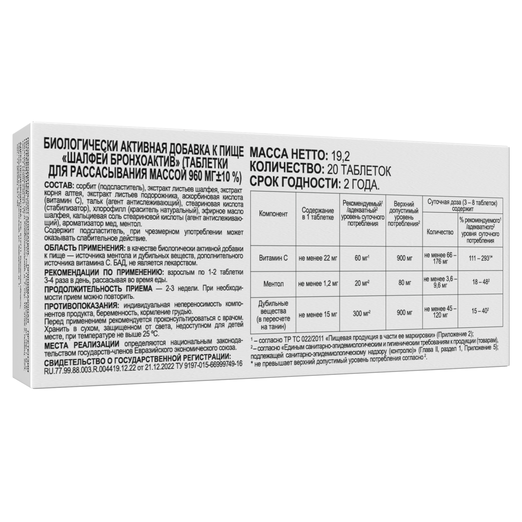 Действующее вещество: экстракт листьев шалфея, экстракт корня алтея, экстракт листьев подорожника, аскорбиновая кислота (витамин С).