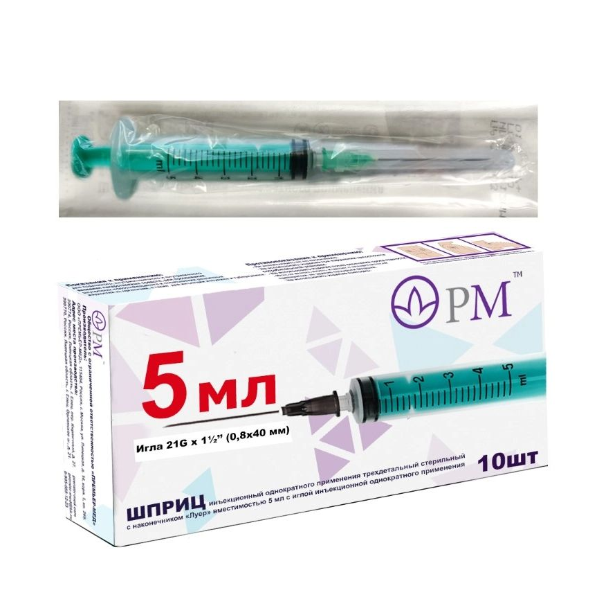 Шприц nрехкомпонентный объем 5 мл с иглой 21G (0,8х40 мм) - это медицинское устройство для введения лекарственных препаратов. Шприц имеет удобный дизайн и идеален для использования в домашних условиях. Игла изготовлена из высококачественной стали, что обеспечивает ее прочность и долговечность. Присутствуют деления на корпусе шприца, которые позволяют точно измерять объем жидкости. Поршень не содержит натуральный латекс, нет риска развития аллергической реакции. Упаковка включает в себя десять шприцев с иглами. Отличное качество изготовления, удобная конструкция, простой в использовании и доступная цена делают этот шприц отличным выбором для всех, кто нуждается в точности дозировки медикаментов.