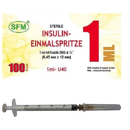 SFM U-40 1 мл 20 шт шприц инсулиновый одноразовый 3-х компонентный игла съемная 26G (0,45 мм х 12 мм)