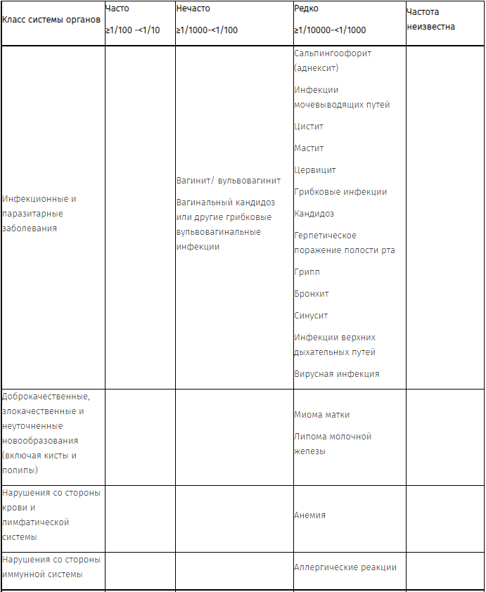 При приеме КОК могут отмечаться нерегулярные кровотечения ("мажущие" кровянистые выделения или "прорывные" кровотечения), особенно в течение первых месяцев применения. Данные о частоте возникновения нежелательных реакций, о которых сообщалось в ходе клинических исследований комбинации этинилэстрадиола и диеногеста, приведены в таблице ниже.