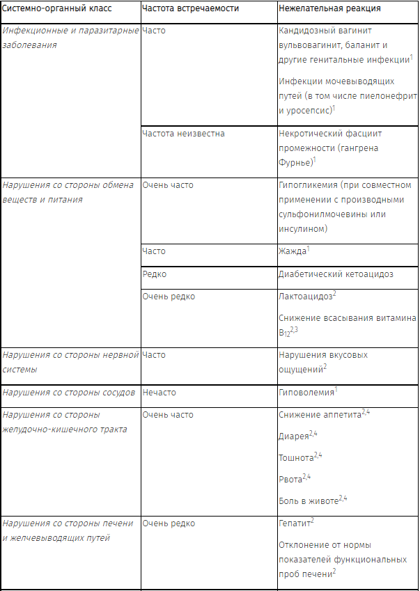 В клинических исследованиях наиболее часто сообщавшимся нежелательным явлением была гипогликемия, которая зависела от типа фоновой терапии, использовавшейся в соответствующих исследованиях, инфекции мочевыводящих и половых путей, увеличение мочеотделения.