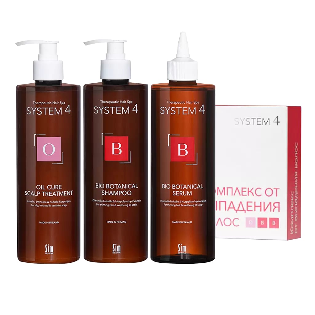 Набор средств от выпадения волос Система 4 состоит из 3-х продуктов, которые взаимодополняют друг друга и направлены на комплексное восстановление волосяного покрова, возвращение ему здорового вида. Продукция прошла тестирование, получила сертификаты качества, а также признание потребителей. В комплекс от выпадения волос входит очищающая маска для кожи головы, био-ботанический шампунь и сыворотка. Его рекомендуют использовать при выпадении волос, вызванное разными факторами. Также продукция отлично справляется с восстановлением кожного покрова при себорейном дерматите, позволяет избавиться от перхоти.