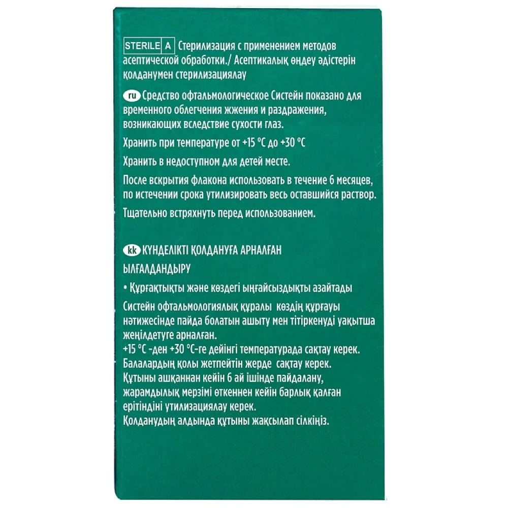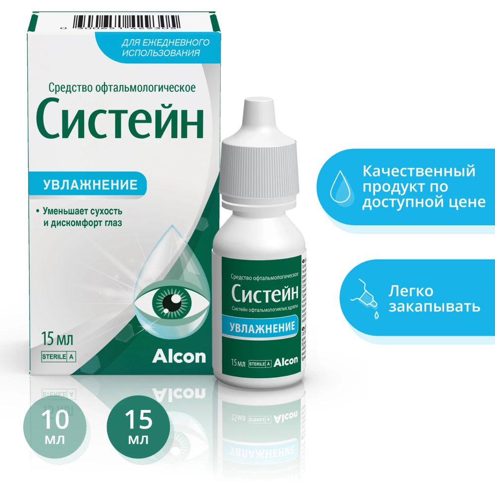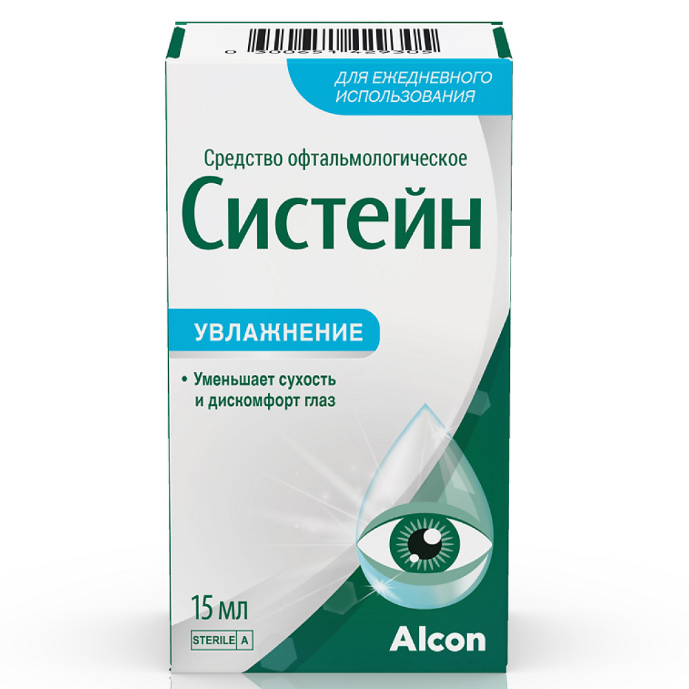 Систейн® средство офтальмологическое – стерильный раствор, содержащий полиэтиленгликоль 400 0,4%, пропиленгликоль 0,3%, гидроксипропилгуар 0,17%-0,20%, кислоту борную 1%, кальция хлорид 0,0053%, магния хлорид 0,0064%, калия хлорид 0,13%,натрия хлорид 0,1%, цинка хлорид 0,00015%, ПОЛИКВАД®