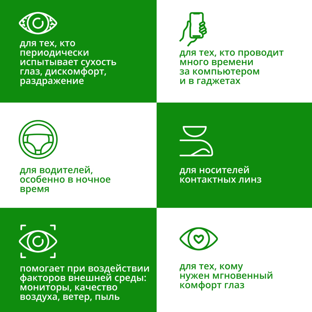 При ношении контактных линз в случае незначительного раздражения, дискомфорта или помутнения, закапайте 1-2 капли в каждый глаз и поморгайте 2-3 раза.