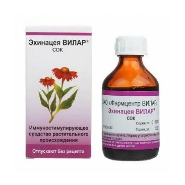 Эхинацея ВИЛАР® сок обладает иммуномодулирующим (стимулирует антителообразование, существенно повышает пролиферативную активность лимфоцитов, стимулирует функциональную активность фагоцитарных клеток) и противовоспалительным действием. Стимулирует костномозговое кроветворение, в результате чего увеличивается число лейкоцитов и клеток ретикуло-эндотелиальной системы селезенки. Активирует преимущественно клеточный иммунитет, стимулирует фагоцитарную активность макрофагов и хемотаксис гранулоцитов, способствует высвобождению цитокинов, увеличивает продукцию интерлейкина-1 макрофагами, ускоряет трансформацию В-лимфоцитов в плазматические клетки, усиливает антителообразование и Т-хелперную активность. Повышает неспецифическую резистентность организма (в т.ч. к возбудителям гриппа и герпеса). Обладает капилляро-протекторным действием.
