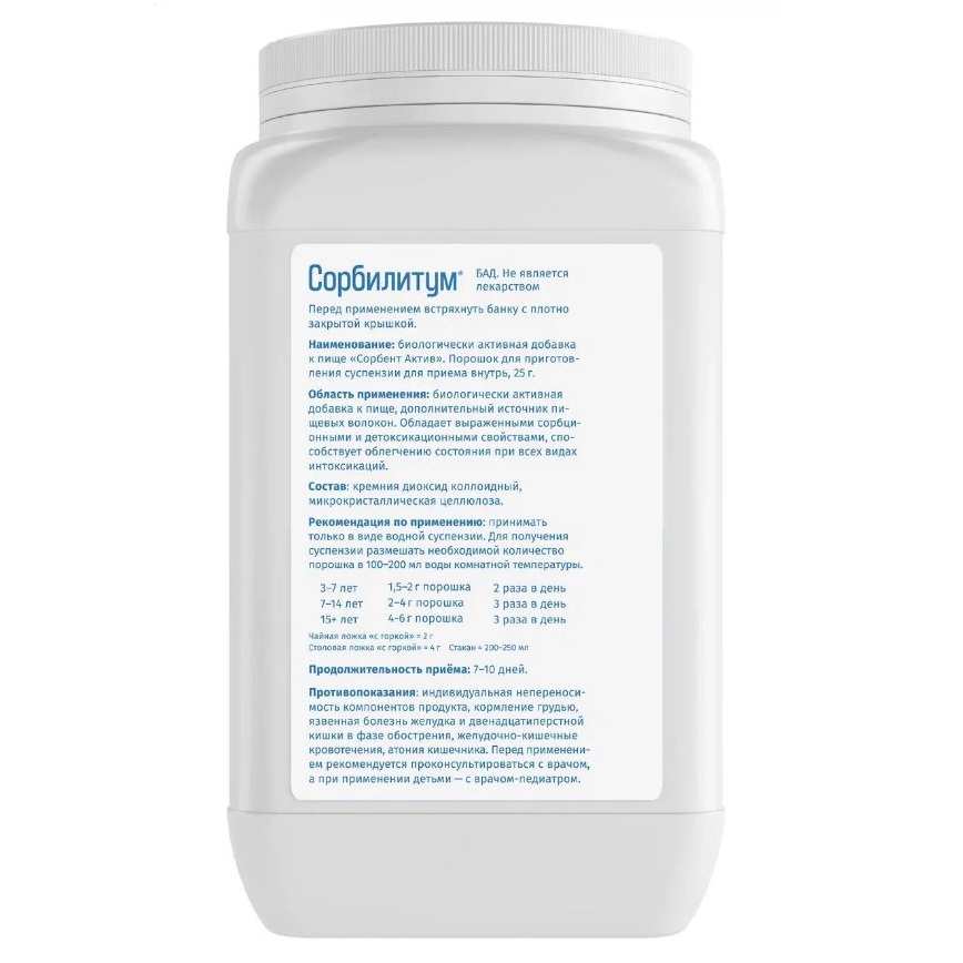 Биологически активная добавка к пище, дополнительный источник пищевых волокон, обладает выраженными сорбционными и детоксикационными свойствами, способствует облегчению состояния при всех видах интоксикаций.