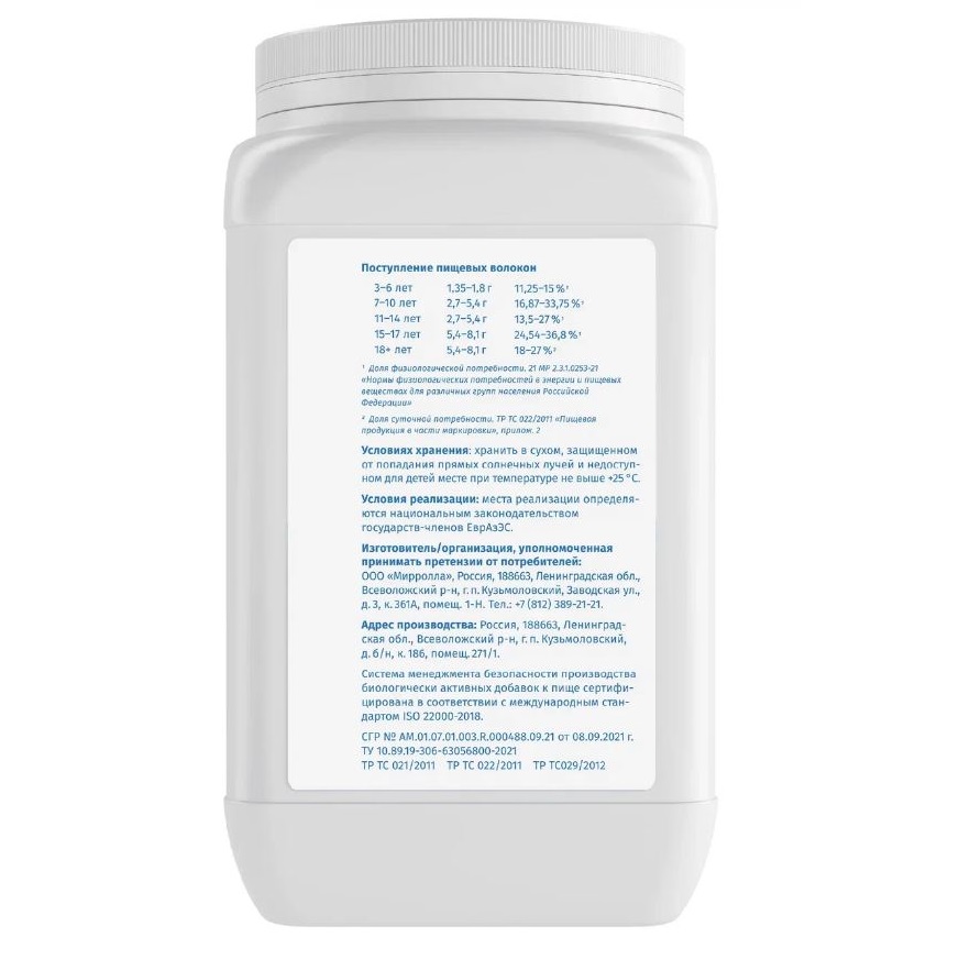 Прием в рекомендованной дозировке обеспечивает поступление пищевых волокон для детей 3-6 лет: 1,35 – 1,8 г (11,25-15%)*, для детей 7-10 лет: 2,7-5,4 г (16,87-33,75%)*, для детей 11-14 лет: 2,7-5,4 г (13,5-27%)*, для детей 15-17 лет: 5,4-8,1 г (24,54-36,8%)*, для взрослых: 5,4-8,1 г (18-27%)**.